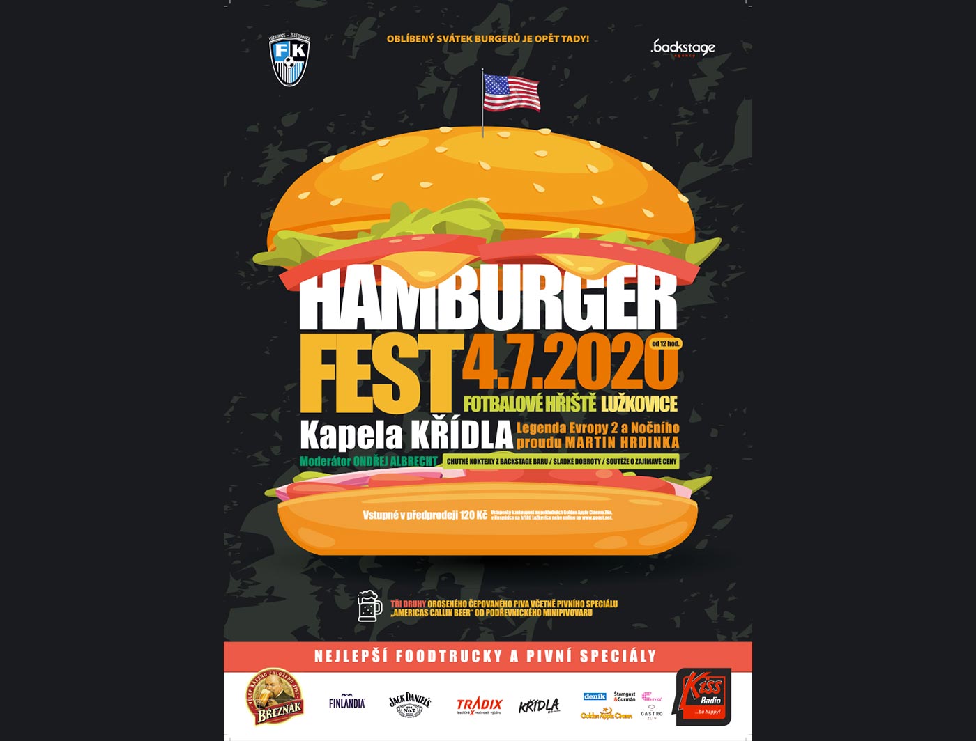 Kromě těch nejchutnějších hamburgerů v různých provedeních, můžete vyzkoušet třeba také hotdogy nebo cukrářské výrobky a zmrzliny. Na své si přijdou i příznivci piva. Na čepu bude cider Strongbow a tři druhy piva včetně pivního speciálu American's Callin Beer od Podřevnického minipivovaru. Pro dámy a další fanoušky míchaných nápojů bude v Backstage baru pestré koktejlové menu.